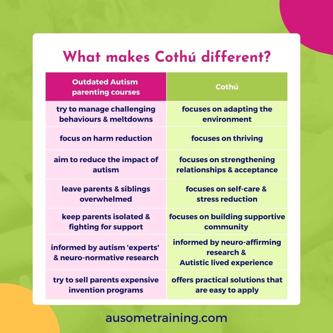 Many traditional parenting courses focus on managing behavour. Cothú takes a different path, supporting you to understand your child from an autistic perspective and build connection, trust, and long-term wellbeing.